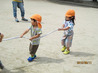 2015年09月28日 9月11日 芋ほり体験 親子参加で芋ほりに行ってきました。 お母さん、お父さんも一緒でみんな嬉しそう♪ 手が汚れるのが嫌であまり触らなかったり、掘るのは母任せと決めていたり、一生懸命スコップや手で掘ったり、初めての登園で思っていたのと違うと大泣きしたり。 たくさんお芋が掘れて子どもたちよりお母さん、お父さんが満足気でした!(^^)! お芋を掘った後は、隣の公園で芋掘りにちなんで綱引きをしました。 掘ったお芋は来れなかったお友達におすそ分けして、つくしっこ園でもふかし芋にしておいしく食べましたよ♪