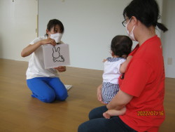 2022年07月20日 7月 親子遊びの会 7月の親子遊びの会は松原 恵美さんによるリトミックあそびでした。 保護者の方に抱っこしてもらい音楽に合わせて揺れたり、ジャンプしたり、回ったりとたっぷりふれあい遊びを楽しみました。 動物のシルエットシアターにも興味津々!パンダやウサギが登場すると指をさして教えてくれました。