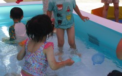 いよいよプール遊びが始まり、子どもたちは大喜び♪大きなプールに入ったり、タライの中に入って泡風呂のようにして気持ちよさそうにしています。これからまだまだ続くプール遊びが楽しみです。