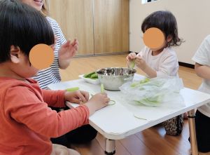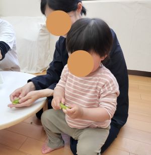 2025年06月18日 つくしっこ園 5月 クッキングの様子 5月は今年度初めてのクッキングをしました。 クッキングの前には「すっぽんぽーん」の絵本をみんな夢中で見ています。 ページが進むにつれ「おもしろい~!」と笑い声も聞こえてきました。 うすいえんどう豆をさやから真剣な表情で取り出しています。みんなとても器用に豆を取り出していました♪ 茹でた豆は希望を聞いて給食のご飯に添えて豆ごはんにしたり、そのままたべたりしました。 自分でさやから出した豆・・・一つだけたべてみようかな・・・と一口パクッ! 「うん、おいしい♡」 おかわりをしているお友だちもいましたよ♪